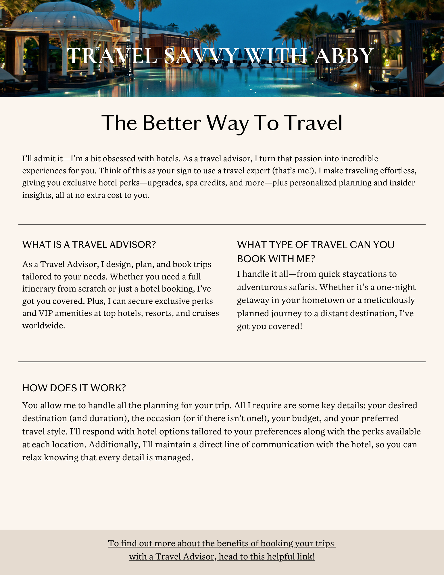 Curious about how Travel Savvy with Abby works? This free FAQ guide breaks it all down for you! Whether you’re planning your next getaway or just exploring what a travel advisor can do, you’ll find answers to the most common questions about booking, pricing, commissions, perks, and what makes my service different.